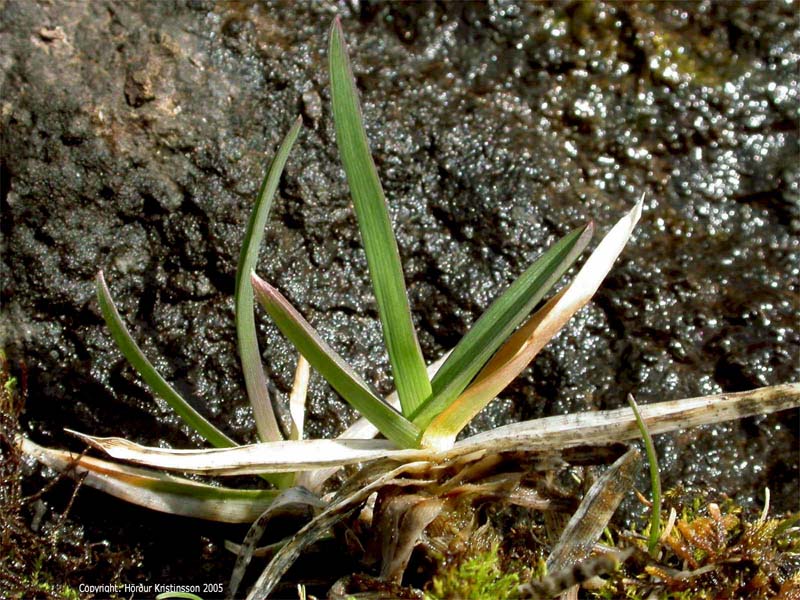 Hér sést blaðsproti af fjallasveifgrasi, með hinum dæmigerðu stuttu og breiðu blöðum með bátlaga oddi að framan. Sést vel á blaðinu sem vísar út til hægri, ef myndin er stækkuð. Tekið í maí 2005 í Leifsstaðabrúnum í Eyjafirði.